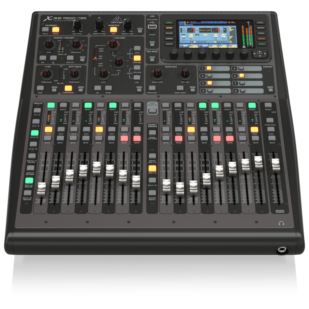 With Behringer’s X32 Producer digital mixer, you can assign signals to eight DCA (Digitally Controlled Amplifier) groups, with simultaneous group level control via dedicated 100mm motorized faders. The X32 Producer has a talkback section (with a built-in mic) that lets you communicate with the artists. The X32 Producer’s robust scene management lets you take snapshots of your mixes that you can recall later. You can even save them to a USB stick! What’s more, there’s a high-resolution 5-inch daylight-viewable color TFT display for easy viewing of your workflow components and parameters.