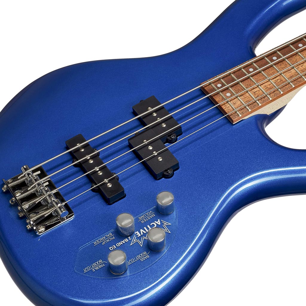 The Action Bass V Plus features 5 strings, a J type pickup set, and a 2-band active eq. Laid out in Volume, Tone, Bass, and Treble configuration, the 2-band EQ provides boost and cut functions for carefully selected bass and treble frequencies. This results in wider tonal range with a firm and focused low-end with a smooth usable boost.