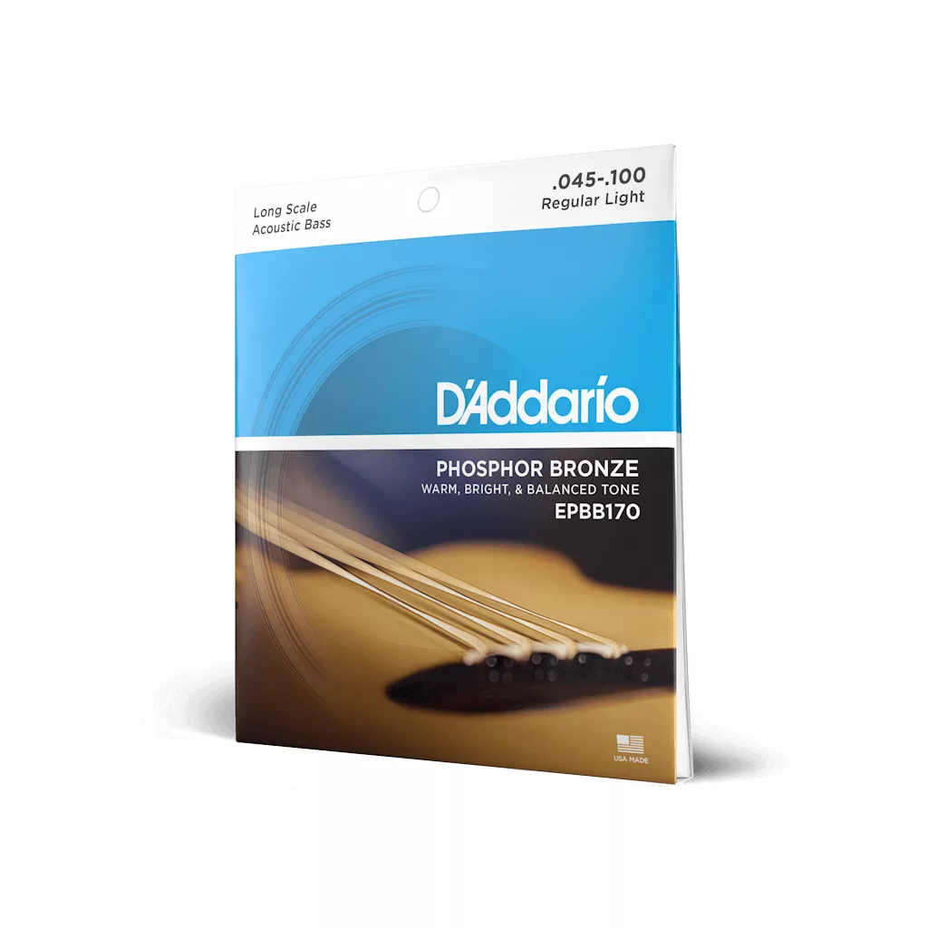 Phosphor Bronze acoustic bass strings give you the sweet tone and easy feel you want when playing unplugged. With their beautiful sonic balance and tonal warmth, D’Addario Phosphor Bronze have become the standard in acoustic bass strings. Precision wound with phosphor bronze wrap wire over a high carbon steel core, our Phosphor Bronze acoustic bass strings provide unparalleled versatility suitable for most acoustic styles.This 45-100 Regular Light Long Scale set fits most standard sized acoustic basses.
