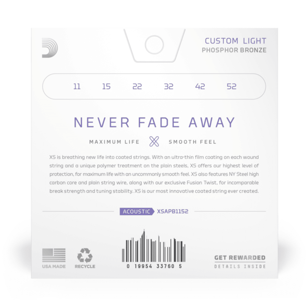 D’Addario XS Acoustic Phosphor Bronze strings combine our most popular acoustic alloy with our most advanced string coating technology, resulting in clear tone, smooth feel, and superior tuning stability – all with the longest possible string life.