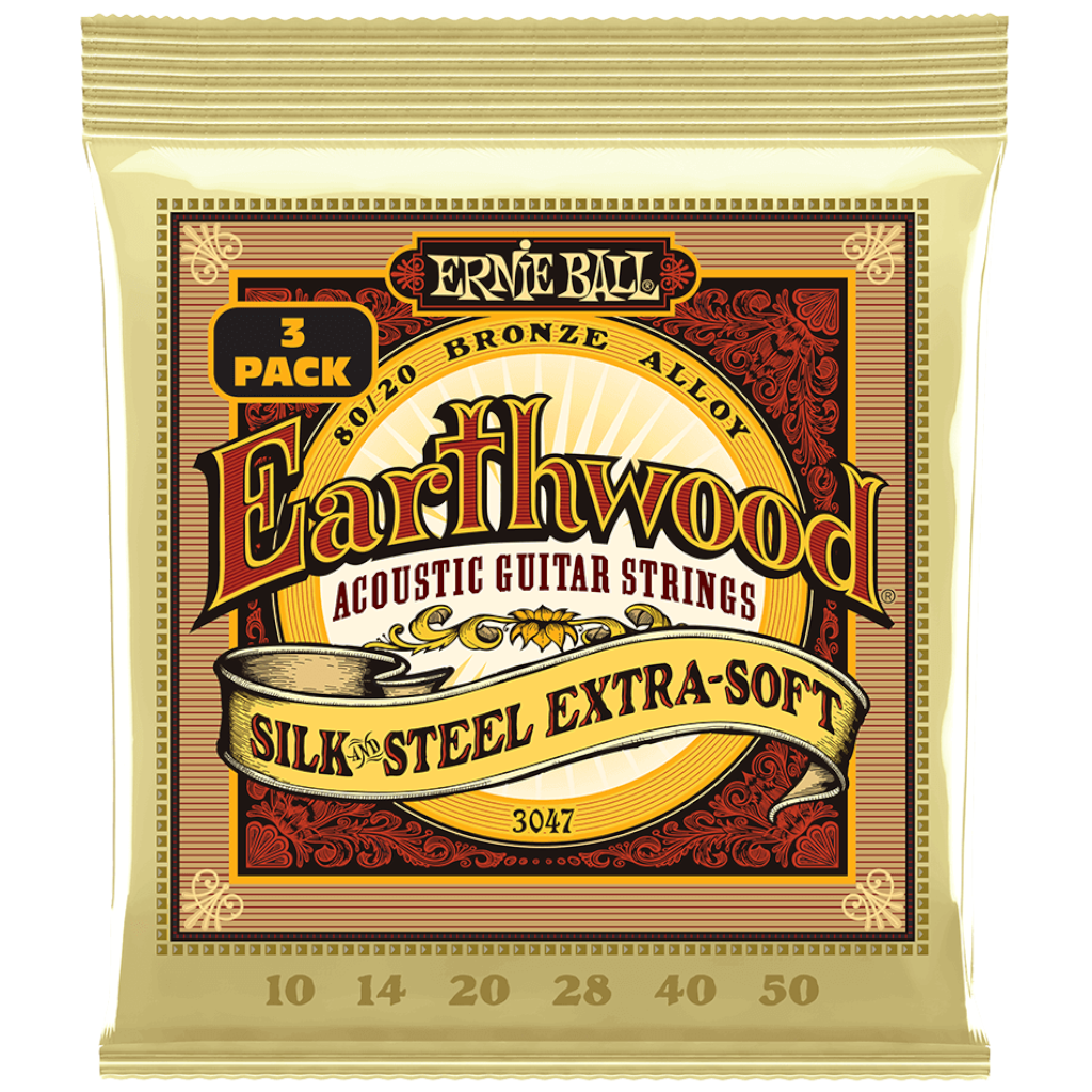 Now available in convenient three-set packs. Ernie Ball Earthwood Silk & Steel Extra Soft 80/20 Bronze acoustic guitar strings are made with an 80/20 bronze alloy wrap, along with a layer of silk between the wrap and steel core. The silk produces a more mellow sound and makes the string feel more comfortable while reducing finger noise.